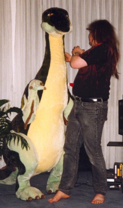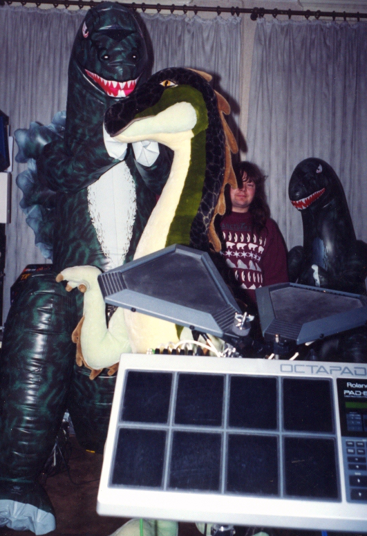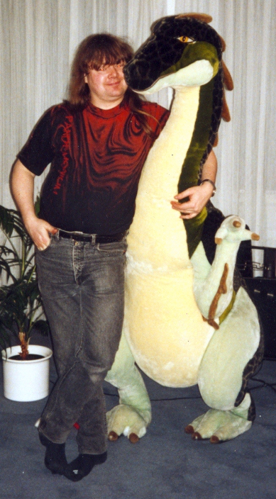 This is a picture of me and my dinosaurs. As you can see, it is getting a bit cramped in my computer room, but dinosaurs are supposed to be huge creatures, so they deserve the space. (And yes, I should have moved the Octapad away for before taking the picture.) The huge Godzilla is about 8 feet high, the smaller Godzilla about 6 feet and the fluffy dinosaur about the same. The first one I got was a fairly small inflateable Godzilla (about 1.5 feet high [no picture yet]). Since I've always been a dinosaur fan, my relatives decided that I might like the larger (6 feet) inflateable Godzilla and bought me one for christmas. [Before anyone gets confused about the age group involved: I'm not talking about early childhood memories here, this happened when I was 28 or something like that.] Anyway, I was very fond of Godzilla and he has been standing in my 'computer room' ever since. When Jurassic Park came out, a couple of shops had the large inflateable Godzillas in stock (yes, I know that Godzilla has little to do with Jurassic Park, but the shop probably figured that 'dinosaur craze' is 'dinosaur craze' and people wouldn't really care what file they were from), so I bought me the huge Godzilla.