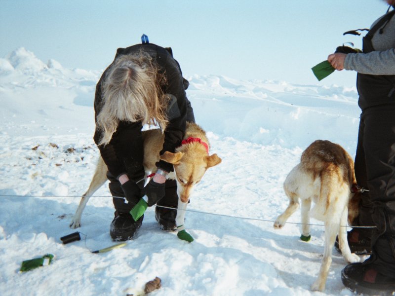 Taking down the camp, putting booties and harnesses on the dogs. Put the leaders in front of the sled and stay with them until all other dogs are attached.