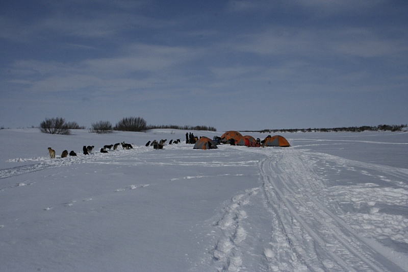 The scenery started to change, though. While the first day and half of the second day were on sea ice, we continued on the coast and along rivers after that. So while the following camps were still set up above water (on rivers), there were hills and bushes around (though little else).