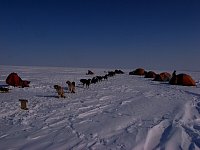 The ice camp at that time was a single tent, three dog sleds and a long row of dogs.