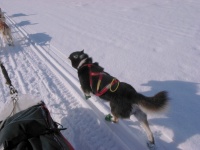 When we had a break, we were supposed to stop at about ten to twenty meters distance from the sled in front of us (roughly one sled length). When I was on the sled in the middle (I was on the last sled for the first two days and then on the middle sled for the rest of the trip), after about three minutes of break I often heard a loud "Whoa! Dino, Blue! Whoa!" behind me and some dogs stood beside me. While the dogs were quite reliably in stopping, it seems that after three minutes of pause they decided that it was time to move on and started on their own.