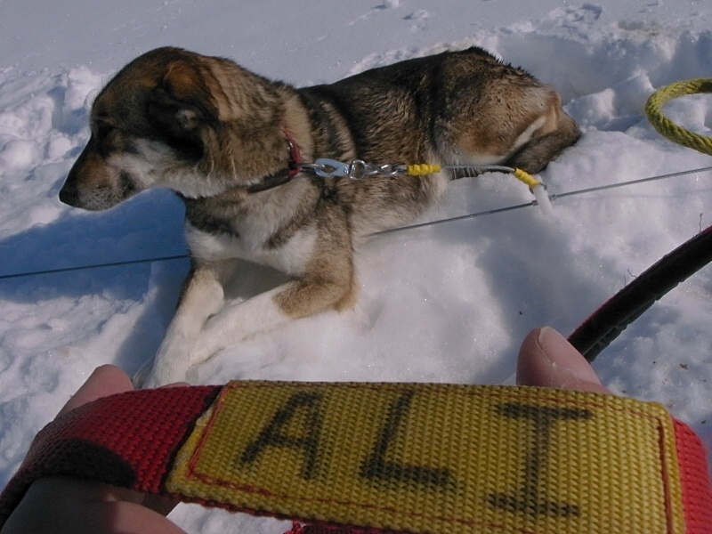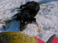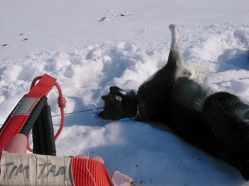 Paila was my lead dog next to Caesar, but Caesar is a fair bit larger and heavier than Paila. So when we stopped on a warm day, Caesar would immediately move to the right of the track and roll in the snow, to cool off. Which was ok, even desirable, as long as the gangline remained reasonably straight and the dogs didn't move too far off the track (which they didn't). Put Paila did her best to be professional and tried to keep the on the track and the gangline straightened out, but Caesar didn't even notice her pulling sideways.