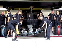 The only time there were assembled cars to be seen on Friday was when they were pushing one to the end of the pit lane for checking by the stewards, who make sure that the car fulfils all F1 regulations.