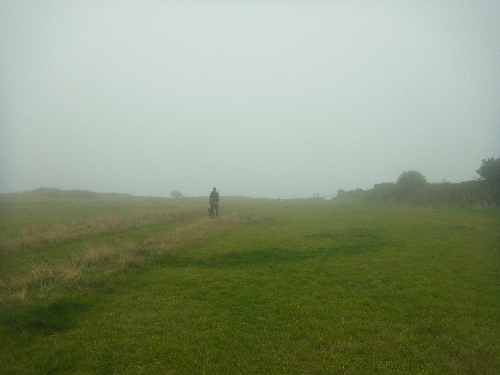 The car park is about a kilometer away from the coast and the fog had closed in again. And somehow it is a strange sight when people in wetsuits and buoyancy jackets come out of the fog and walk over some green meadow, with a couple of cows grazing nearby, ignoring them.