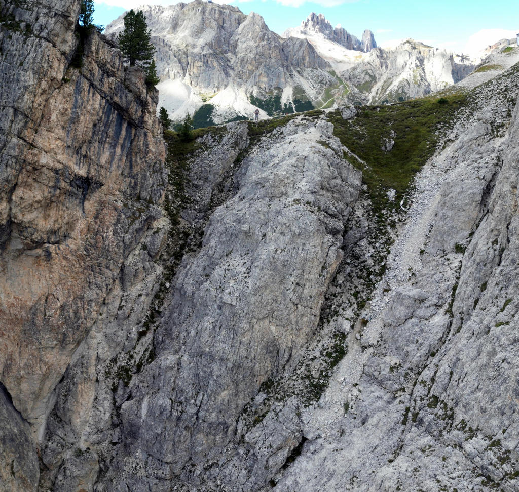 There's a Via Ferrata going up one of the rock faces. But with a difficulty up to C/D, it is way out of my league. And the tricky parts aren't simply a few steps, but longer passages. But I still found some descriptions of this Via Ferrata mentioning that it is suitable for beginners and 'families with active children'. Which makes me wonder what the average life expectancy for children in the Dolomites is...