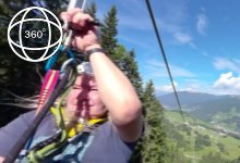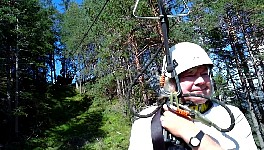 On the first run down the zipline they recommended the comfortable harness, as I had a 360° camera on a selfie-stick with me. The harness is attached to the 'cable runner' at two points, so it doesn't twist and turn much when going down the cable and provides a steadier platform for shooting video.