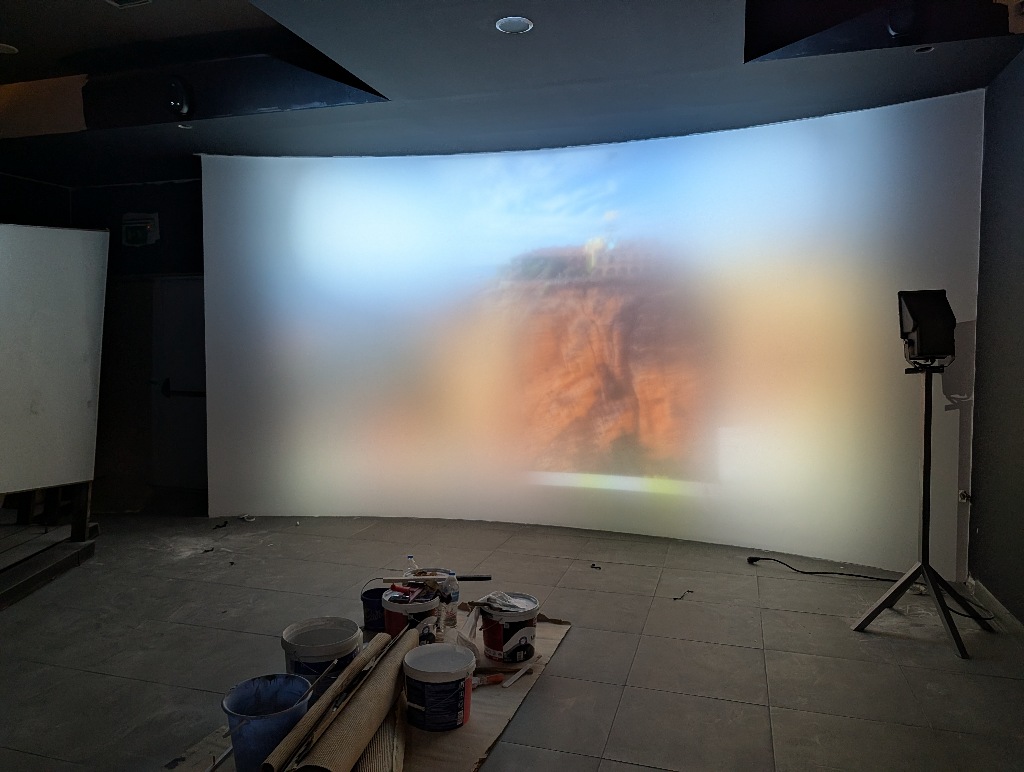 The blurring on the screen hasn't been added to hide any confidential information. It's just that the projector had only been recently installed and there was a translucent plastic cap on the lens to protect it from dust and splashed paint. The image is some common Windows background image and has nothing to do with the Olympics.