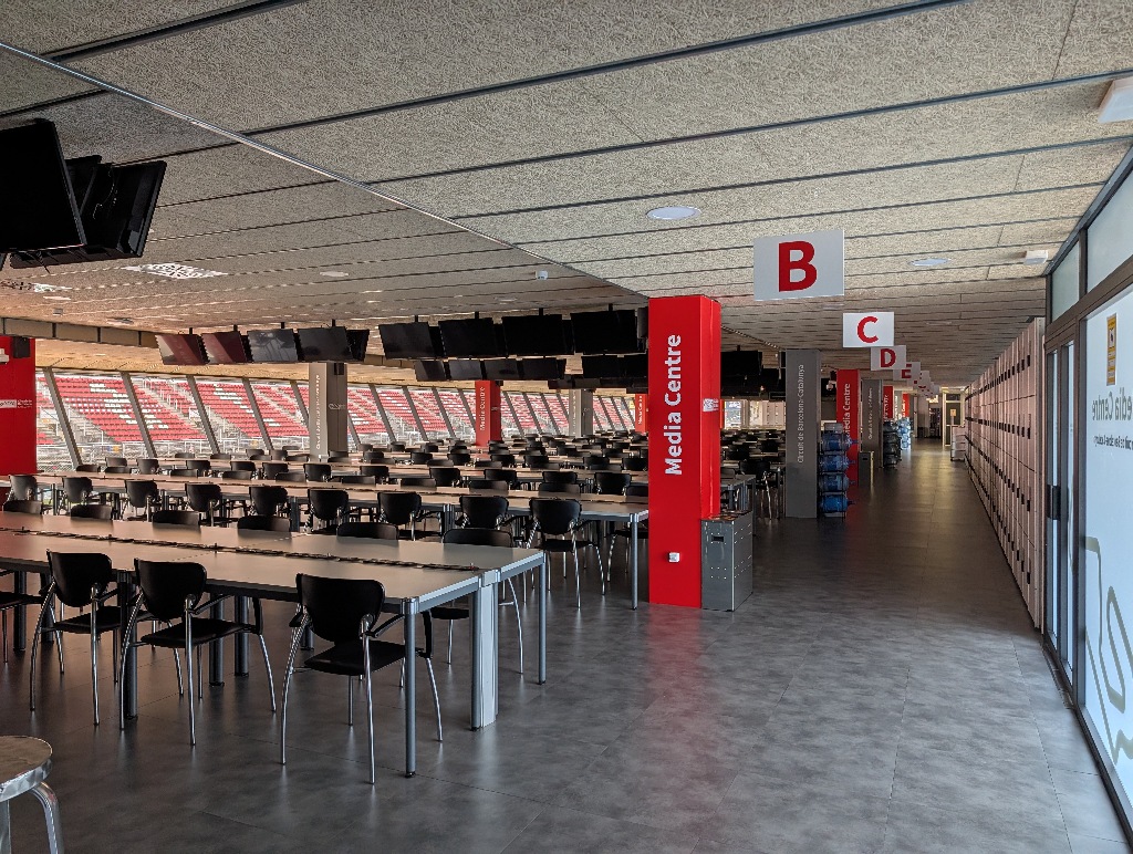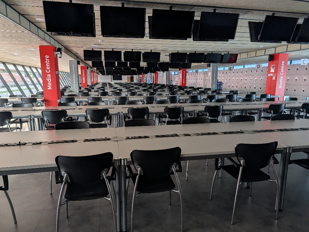 The location was unexpected, as the media centre is mainly for sports writers (the TV commenters are usually sitting in glass boxes along the upper parts of the stands opposite the pitlane). And the sports writers don't really need to see what's happening in the pitlane, as they will be looking more at the info screens and their laptops most of the time, anyway.
