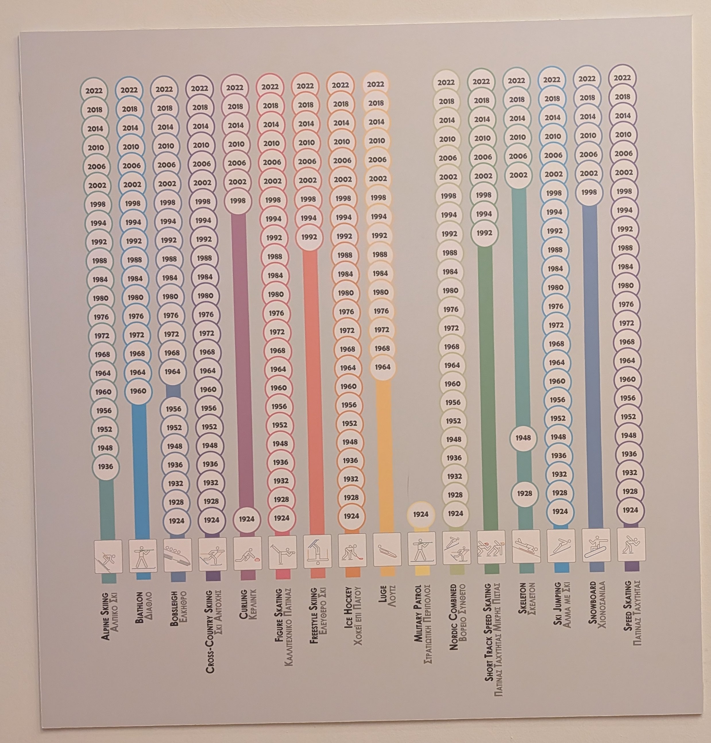 For the winter sports, due to their shorter history and lower number of events, there are only two obvious oddities - curling, which was absent between 1924 and 1998 and skeleton, which appeared in 1928 then took a 20-year break until 1948, decided that it wasn't really worth making an appearance before coming back for good more than half a century later in 2002.