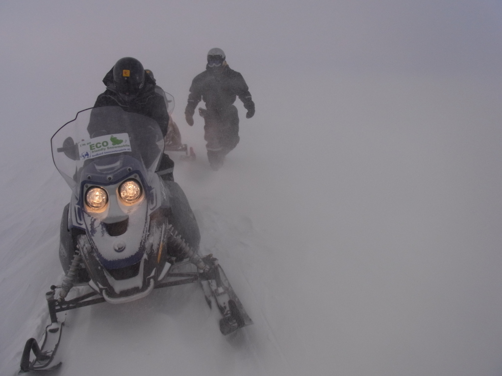 Until we crossed over a small hill onto a glacier, where we suddenly were in a snowstorm with a visibility of 50 meters or less. We continued for a bit, but with still more than 15 km to go and conditions not getting better, the decision was made to stop and turn around.