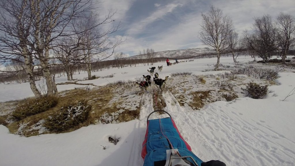 The downside of the well socialized dogs was that they didn't like to be too far from each other, so most of the time we were running quite close to each other. The goal was to keep about one dog length between the lead dog and the sled in front - on the Canada trips, the teams were mostly a hundred meters or more apart from each other.