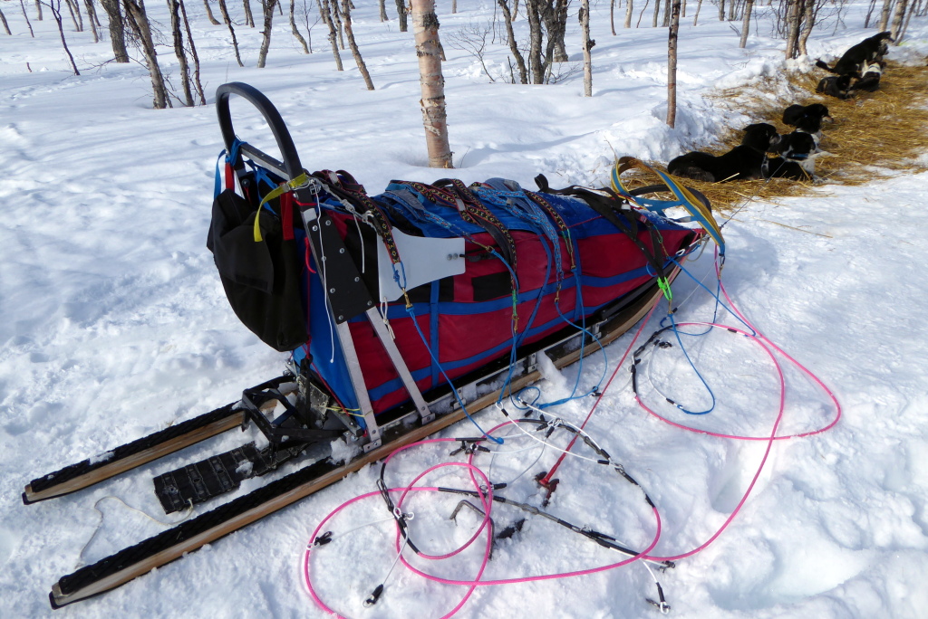 The sleds were amazingly robust (something that I did appreciate a couple of days later). Kenneth builds them himself and while last year's sleds were light with lots of wood, here only the runners were wooden and the rest was made from aluminium tubes, which might not have the same 'nature' look, but are much less breakable.