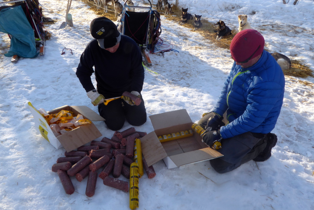 The sausages made the meat much easier to handle and cut than the more commonly used blocks of meat, they were more hygienic when they were partly thawed and also easier to pack and count. (As we had 36 dogs, and they got half a sausage each, we needed to get two boxes of sausages for each meal and if there weren't two sausages left at the end, something went wrong. The extra sausages then went into a separate box, so we didn't need to think about boxes that had less than ten sausages. Counting to less than ten does not sound like an issue, but if it's cold, it has been a long day and everyone is tired, it is always a good idea to have fewer things that could go wrong.)