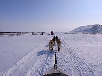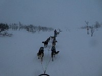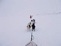The main challenge here is that the dogs are really eager to go home. The little 'snow storm' behind the sleds, especially on the last two pictures, shows that we all were standing heavily on our brakes.