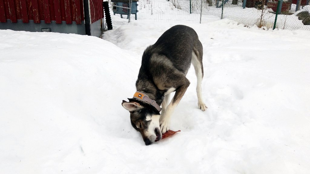 The total distance is also a bit uncertain this time. I was only sitting in the sled during the puppy run. And I don't know how long I have been on the sled during the photo day and how much I have been riding on the snowmobile. Not counting the time in the sled and assuming I did about 10 km on the sled with sixteen dogs in front of me, the total distance I have been driving a sled is more likely to be around 340 km.