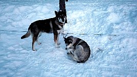 Which, fortunately, didn't turn out to be a problem. There weren't any difficulties on the trail due to inexperience or nervousness around the dogs. The few minor issues we had on the trail (like one lead dog going left around a tree and the other going to the right, or the one where a team turned right at a T-junction where Matti had turned left) could have happened to anyone and were quickly sorted out.