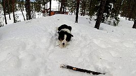 Things didn't go quite as planned, though. We had a bad trail with deep, freshly fallen snow (in a beautiful environment, I have to concede, but still a slow trail), so we arrived at the location later than planned. (And as we didn't have an ice drill with us, we didn't have to option of stopping somewhere else.) And then the way to the brook was through deep snow, so the "it's about five minutes walk in this direction" became half an hour. The directions were a bit vague as well. "It's next to the birch tree." isn't that helpful in a forest. It was a spruce forest, so the birch tree did stand out a bit, but that doesn't make finding a specific tree in a forest easy. And it was harder to get down to the brook than expected. (I didn't experience any of this first hand, as I stayed at the camp and was busy sawing a dead tree into small pieces to fire the stove.)