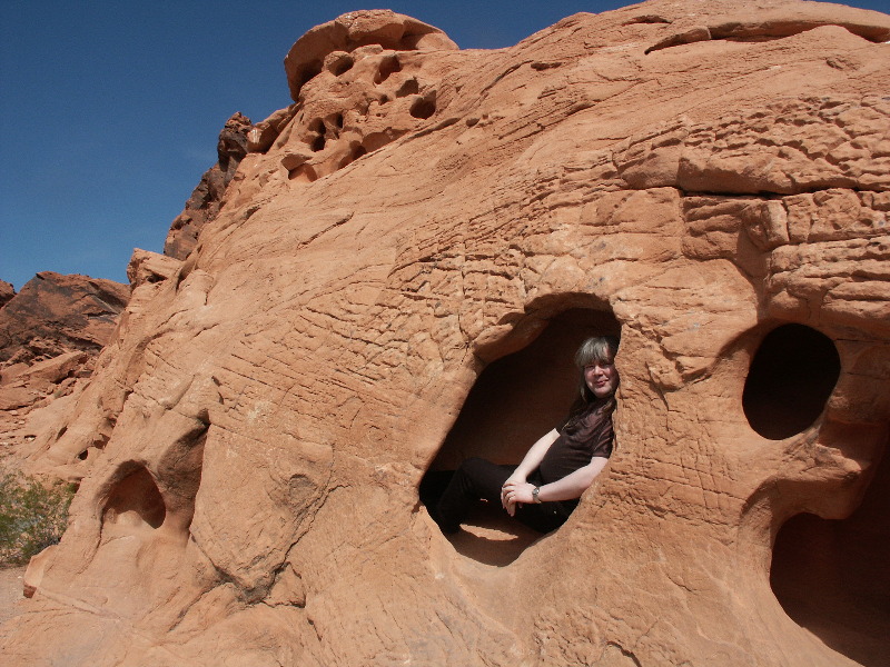 The first stop was in the Valley of Fire State Park, which is sort of on the way between Las Vegas and Zion National Park. Most travel guides seem to skimp over this park, eager to get to the main attractions, but the Valley of Fire is well worth a stop. It is also a very fitting first stop, since it's a good overture or preview of coming attractions for the other parks. It has got nice looking red stone formations, with neat little holes to sit in and gaps and pits to crawl and climb in and out of, it has a bit of a slot canyon, an arch, strangely shaped rock formations tease the imagination and petroglyphs, all in a nice, small, and easy to handle size.