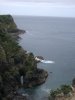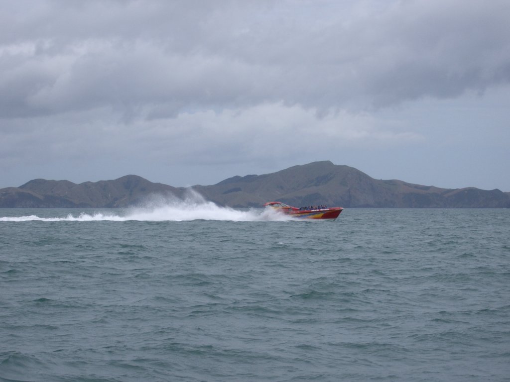 In the late afternoon I got a bit of the speed thrill I hadn't got on the racing yacht. A bit outside the Bay of Islands, there's a rocky island sticking out of the ocean which has a natural tunnel through it. This is a popular attraction and there are two companies offering jet boat rides to the "Hole in the Rock". I went with "Mack Attack". At more than 70 km/h through the bay, it's a jet boat catamaran that's moving seriously fast for something moving on water. The ride to the rock is a bit rough. At first it's like going over a cobblestone road at speed and then, when you leave the bay and head out to the open ocean, it's more like going over a road with large potholes. But fun. The trip through the hole itself was a bit of a letdown, though. The jet boat was waiting outside the hole, engines roaring, waiting for the right moment in the ups and downs of the waves, like an animal ready to pounce - and then it slowly drove through the hole. Everyone expected it to rush through at speed, so just having a leisurely glide through it was anti-climatic. But after that it was a fast ride again, back to Paihia. Not much variety, basically just a quick trip to the "Hole in the Rock" and back, but my first ride in a jet boat.