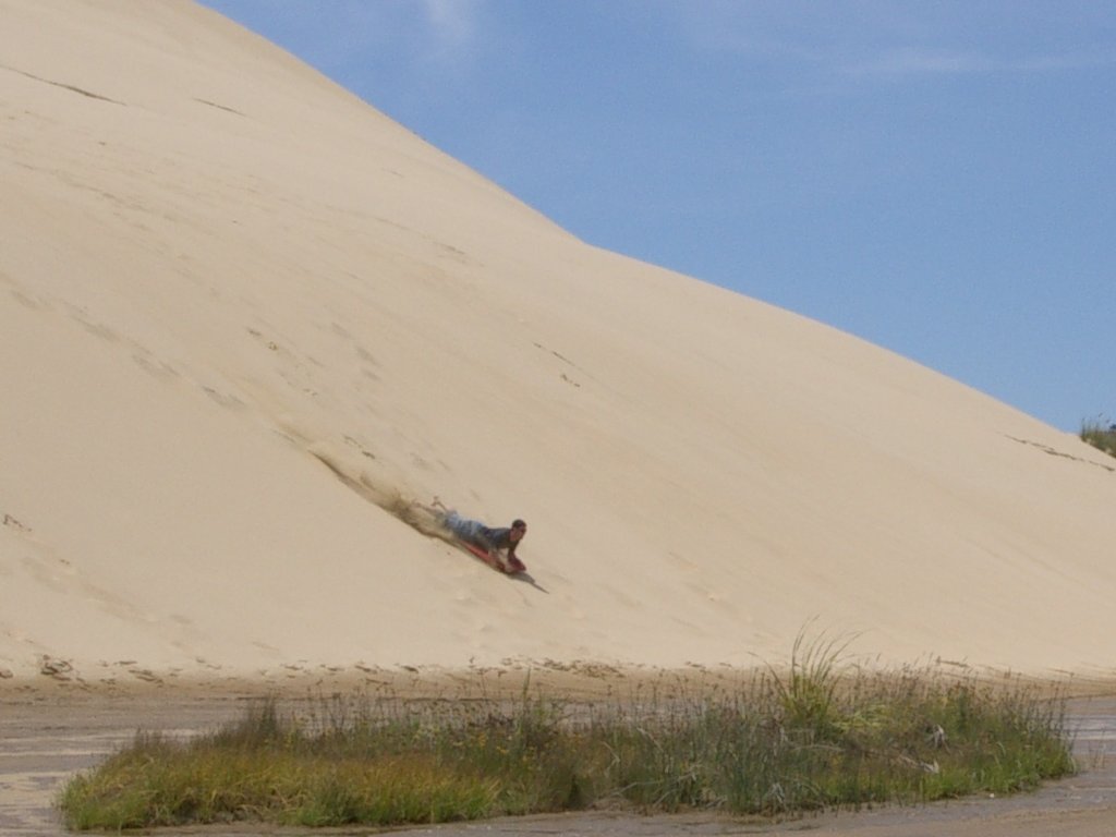 We stopped at a large dune on the north end of Ninety Mile Beach and the bus had a number of sandboards in the back. It doesn't show much on the pictures, but the dune was quite high and, especially looking down, seemed dauntingly steep. Almost everyone (who, like me, had never done that before) got on their boards and said "I'll be breaking with my feet all the time and go slowly", which held true for about two seconds going downhill before everyone noticed "This is not scary at all, this is fun!" and sped down.